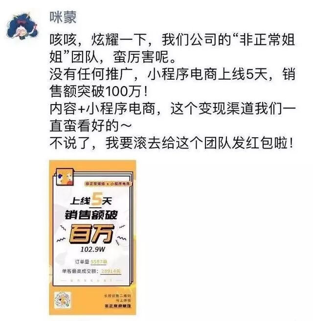 6月6日晚,咪蒙在自己的朋友圈内首次公开了电商试水的”小成绩”:上线 5 天,销售额突破 100 万。
