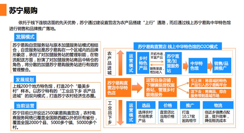 农村淘宝、京东3F战略、苏宁中华特色馆、拼多多社交电商以及唯品会的唯爱工坊是中国农村电商的典型平台,其中苏宁获得最佳口碑。