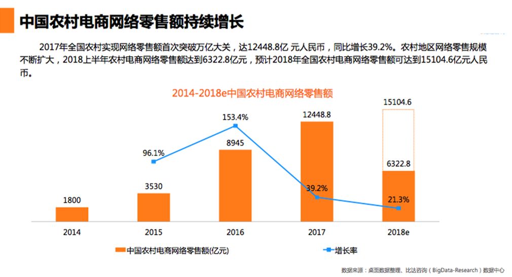 根据数据显示,2018年零售额持续增长,但占总体电商市场份额没有提高。农村电商的利好政策不断出台,农村网民规模不断扩大,C轮融资轮次增多,中国农村电商产业总体处于良好的发展环境。
