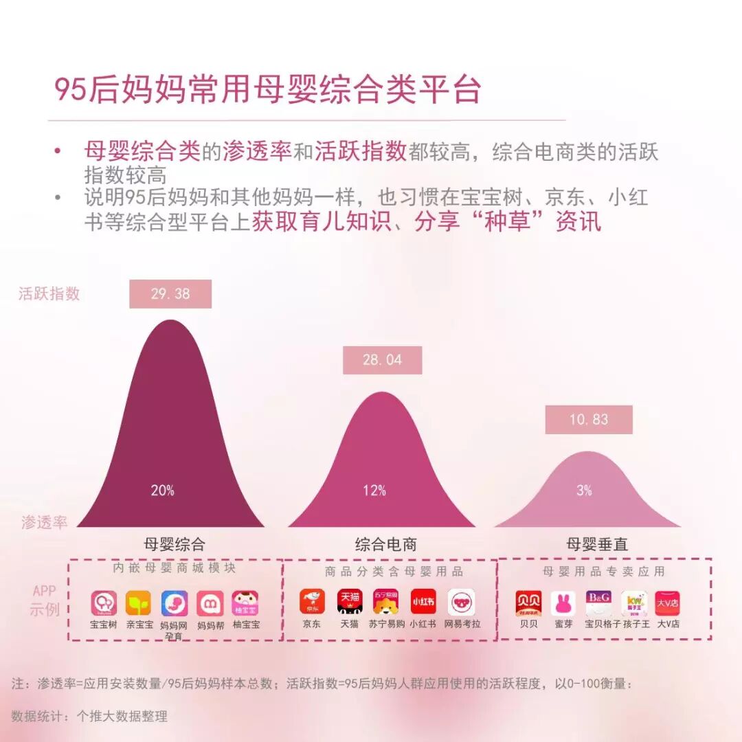 数据显示,与母婴相关的电商平台中,宝宝树、亲宝宝等母婴综合类平台的渗透率和活跃指数都较高,而京东、小红书等综合电商类平台的活跃指数亦较高。这些平台为拥有相同特性的宝妈们搭建了沟通交流的桥梁,也让拥有极强分享意愿的95后妈妈们找到了获取育儿知识、分享“种草”的渠道。