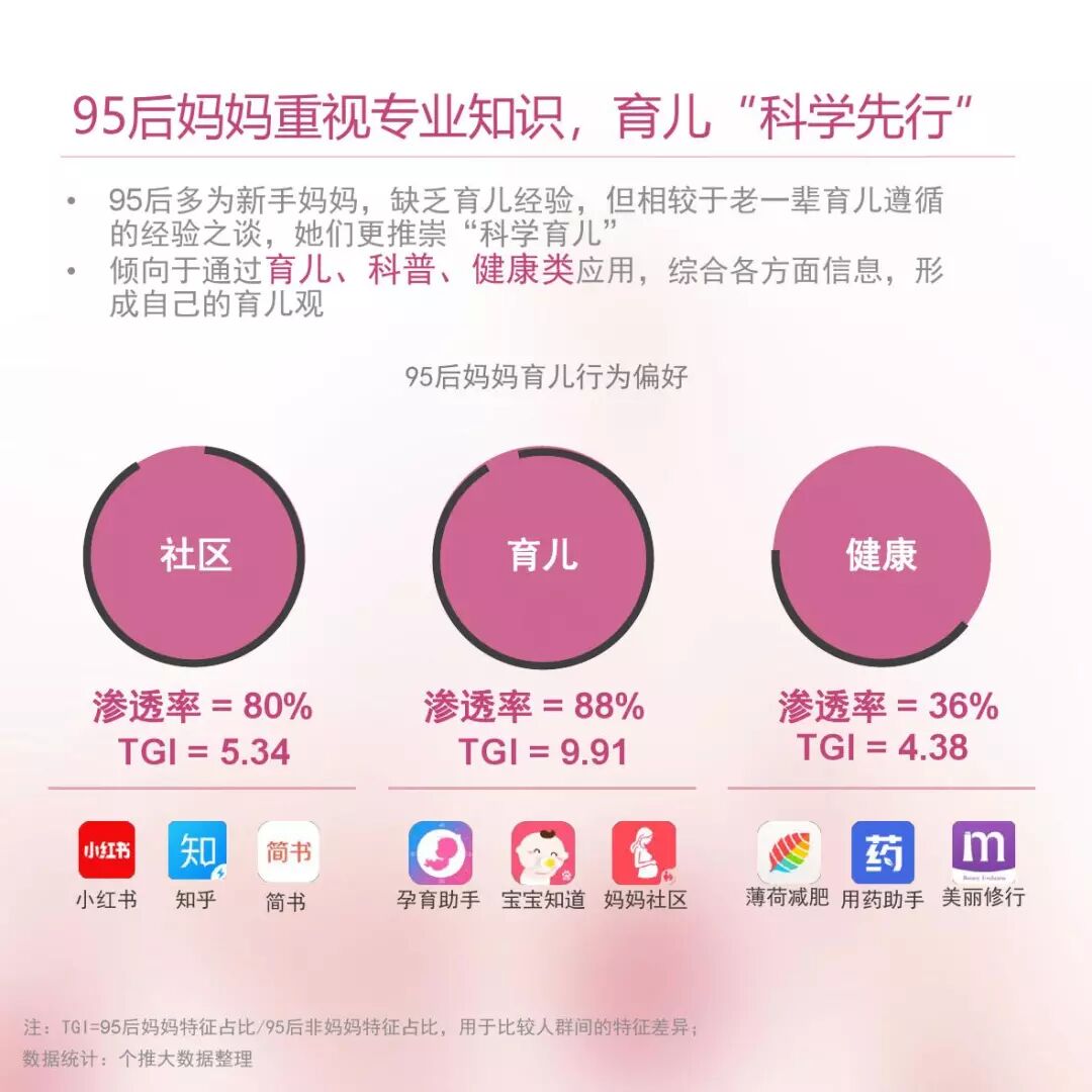 被称为互联网原住民的90、95后,在养娃这件事上也更偏向信任互联网上的专业知识,将母婴综合社区、孕育工具助手等应用作为获取育儿知识、记录宝宝成长的主要方式。